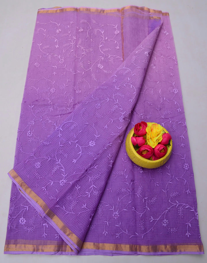 Manorama- Purple Kota Doria All Over Embroidery Work Saree, This Kota Doria Saree In Cotton Comes With Blouse.Wear This Kota Doria Saree as Office Wear Saree, Daily Wear Saree Or Kitty Party Saree. Saree Length - 6.5 Mtr With Blouse.