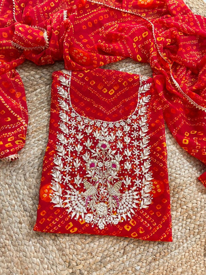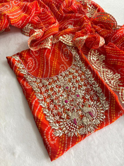Gotta Patti work is a must-have for any ethnic collector because of its unique sheen, which can be found in bandhani outfits and bandhej sarees. Wear the exquisite designs of Gotta Patti with our renowned selection of unstitched and stitched clothing.